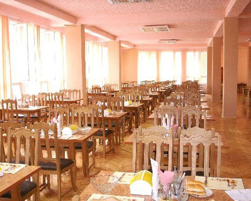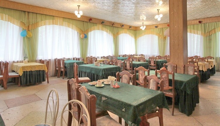 Столовая здравницы имеет обеденный зал, выполненный в розово-постельных тонах с деревянной мебелью. Здесь по заказному диетическому меню организуется питание для 440 отдыхающих в одну смену. Помимо диет здесь можно заказать вегетарианское или детское меню. Превосходная сервировка всегда способствует приятному аппетиту.